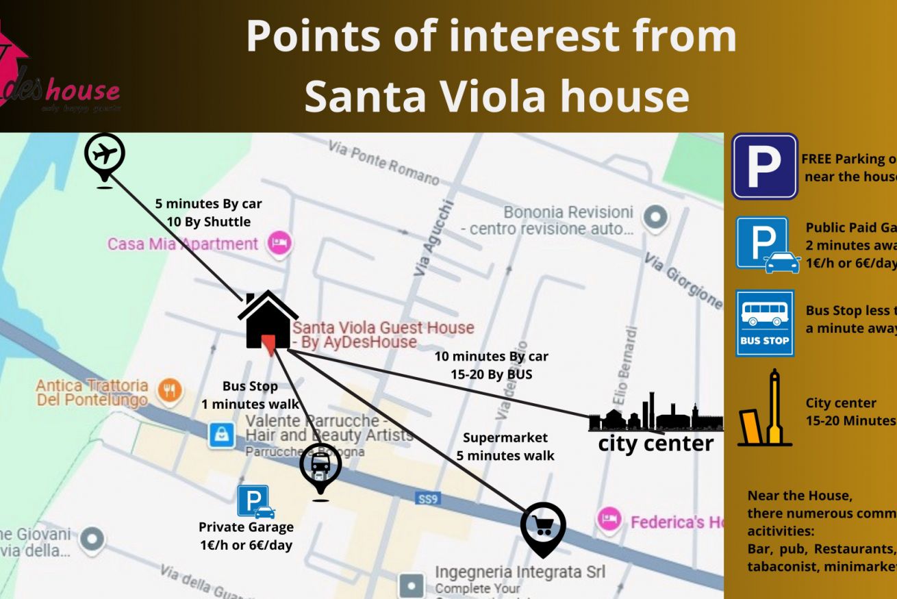 Nei pressi della casa è possibile parcheggiare in strada gratuitamente, oppure in parcheggio privato coperto (costo 1€/ ora oppure 6€/Giorno) nelle vicinanze vi sono fermate dei mezzi pubblici che consentono di raggiungere in tempi brevi qualsiasi punto della città e soprattutto i principali punti di interesse come Piazza Maggiore, le due torri o il fulcro della vita notturna e del buon cibo, piuttosto che l'aeroporto, la Stazione di Treni alta velocità, il distretto espositivo della Fiera, i principali Ospedali.